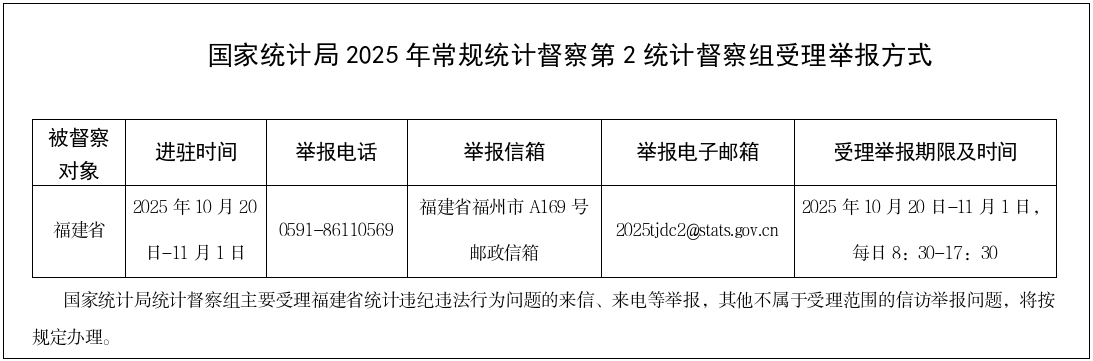 為深入貫徹落實習近平總書記關于統計工作的重要講話和重要指示批示精神,根據黨中央和國務院授權,國家統計局2025年常規統計督察第2統計督察組日前進駐福建省開展統計督察工作,實地督察時間13天左右。